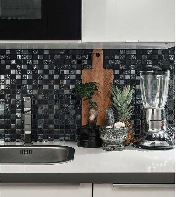 Зеркальная мозаика не считается оптимальным вариантом для кухни, поскольку требует повышенного внимания и более тщательного ухода. Но для тех кухонь, в которых готовка не является частым времяпрепровождением, такая мозаика может стать достойным и стильным украшением.