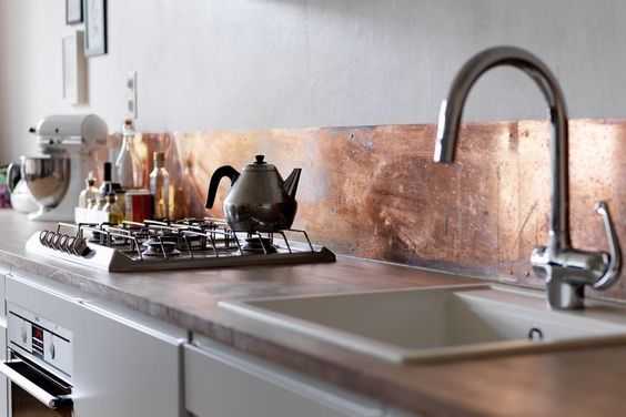 - Изделия из металла – это наиболее редкий, хотя и эффектный вариант отделки кухонного фартука. Тонкие металлические пластинки на основе из пластика или керамики выглядят оригинально и стильно, при этом являясь вполне подходящим вариантом для кухни: материал не боится воды и жира, не окисляется и сохраняет целостность на протяжении процесса эксплуатации.