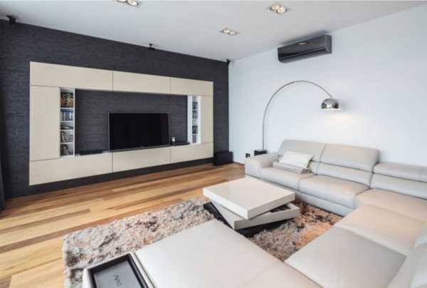 - Использование холодных оттенков. Если сделать гостиную зону в холодных и светлых тонах – визуально она станет больше. Дополнением к такой идее станут меховые накидки и несколько самодельных деревянных полочек.