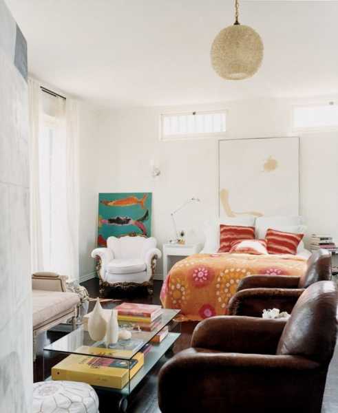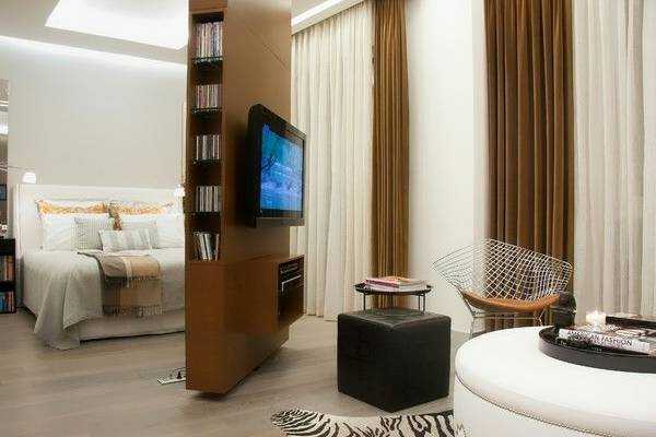 Конечно, не все захотят использовать такой вариант, ведь спальня все же должна быть отдельной зоной. На самом деле нужно учитывать исключительно квадратуру вашей квартиры, и если она позволит поставить кровать и небольшой диван для гостей – это будет самым оптимальным вариантом. Тогда мы попросту отделим спальную зону от гостевой с помощью небольшой перегородки, стеллажа или прозрачного балдахина.