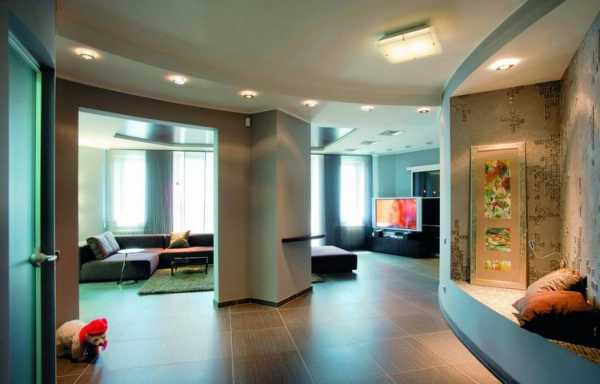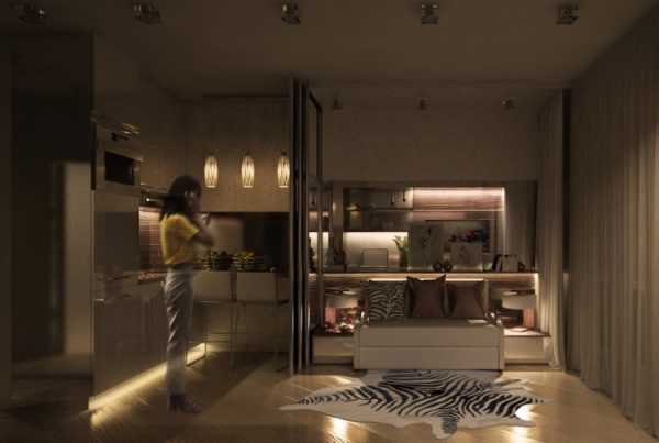 - Не стоит покупать большие массивные люстры. Они забирают пространство в комнате и в основном рассеивают свет. Лучше всего сделать точечное освещение в интерьере квартиры-студии, которое могло бы включаться и освещать отдельные зоны. Отличным дополнением к нему будет подсветка (однотонная или цветная по желанию).