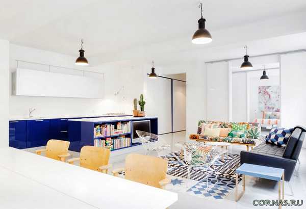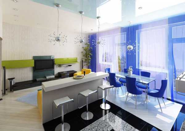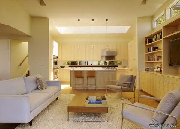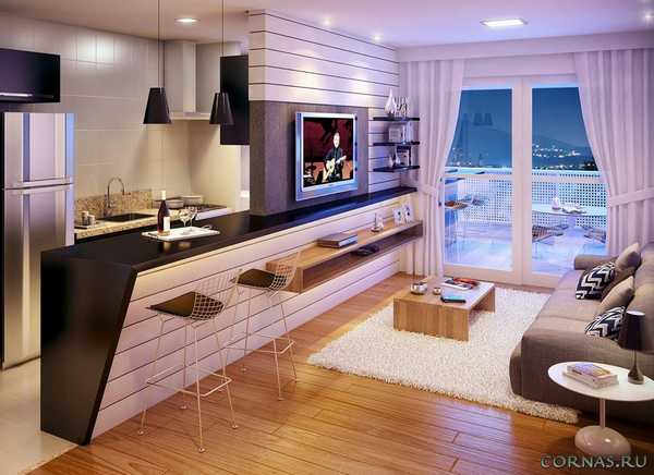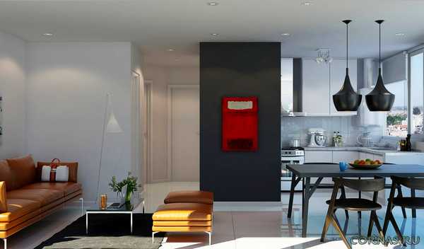 - Для зонирования помещения используйте не только разные цветовые оттенки пола и стен, а также правильную мебель (барная стойка, стеллаж, шкаф).