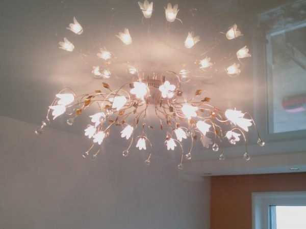 - Классические подвесные люстры – безопасные устройства, если расстояние от плафонов до пленочного покрытия составляет 20 см и более. При несоблюдении этого параметра следует устанавливать в них только светодиодные лампы: простые лампочки накаливания вырабатывают тепло, особенно в многоярусных, с несколькими рожками. В случае превышения температурного режима (выше 60 ⁰С) пленка быстро придет в негодность: потемнеет, пожелтеет, утратит эластичность, может провиснуть.