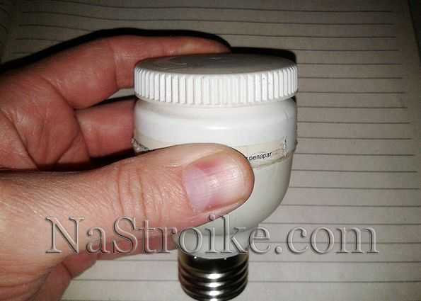 Иногда плата от зарядки может быть достаточно длинной и в корпусе патрона не хватит места для ее установки. Тогда на помощь придет пластмассовая коробка, например, от лекарств. Вырезается недостающая длина, и приклеивается к корпусу патрона. Диаметр колбы нужно подобрать соразмерный с диаметром корпуса патрона.