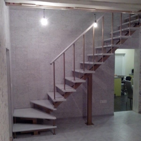 Г-образная лестница на металлическом каркасе монокосоур с забежными ступенями МК-ГЗ-01