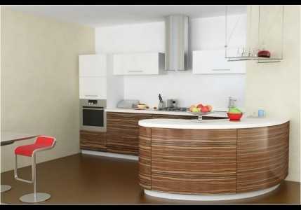 Понятия эти довольно часто путают, хотя здесь производство осуществляется совсем иным методом. Акриловая пленка – многослойный бумажный композит, пропитываемый абсорбентами и акриловой смолой, приклеивается на поверхность плиты под давлением. Покрытие весьма прочное, и к тому же обладает гибкостью большей, чем акриловое стекло. Не только стандартные, но радиусные фасады здесь вполне возможны. Что, конечно, значительно увеличивает привлекательность угловых и прямых моделей. На фото – радиусные фасады с акриловой пленкой.