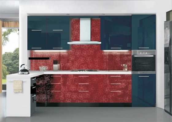 Получаемая глянцевая поверхность отражает свет, за счет чего помещение визуально расширяется. При декорировании кухни большим плюсом является широкая цветовая палитра.