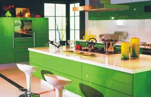 Панели МДФ применяют для изготовления кухонь любой конфигурации – линейных, островных и т.д. Во многих случаях покупатели отдают предпочтение угловым моделям. Они отлично вписываются в небольшие комнаты, а яркие цвета и глянцевый блеск зрительно увеличивают помещения.