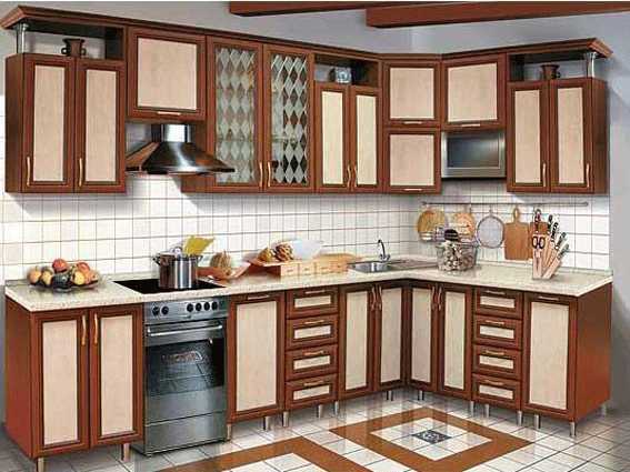 Каркас и дверцы шкафов кухонного гарнитура выполняются из плит МДФ. Но при этом оформление может быть совершенно разным. Угловая кухня с фрезерованными створками «под дерево» и мебель хай-тек, где радиусные фасады блистают глянцем, являются гарнитурами из МДФ, хотя внешний вид у них совершенно разный.