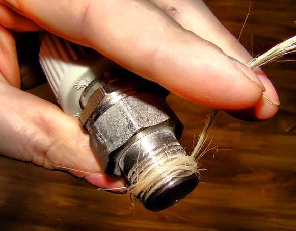 Резьбовое соединение следует смазать пастой Unipak и обмотать паклей. Некоторые сантехники используют ФУМ-ленту, но пакля с пастой надежнее. Наносим обильный слой на резьбу и по ее ходу наматываем волокна льняной пакли.