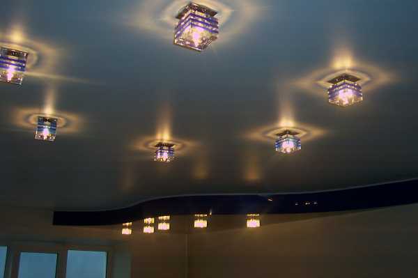 Вот наглядный пример дизайна разных помещений с применением светильников разных форм в двухуровневом натяжном потолке.