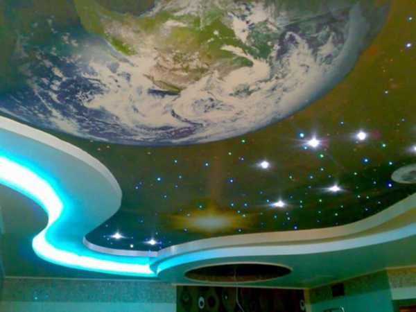 Имитация звездного неба на потолке- еще один из способов разнообразить стиль комнаты. Выполняется за счет встроенных в гипсокартон ламп.