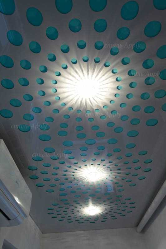 А можно обыграть конструктивные особенности резных натяжных потолков и организовать в своей квартире внутреннее полупрозрачное освещение. В этом случае вы умело используете свободное пространство между слоями и создаете неповторимый объемный эффект, делая, тем самым, перфорированный узор удивительно реалистичным и выразительным. Вот как это выглядит на фото.