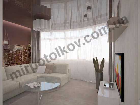 натяжная стена с фото за диваном