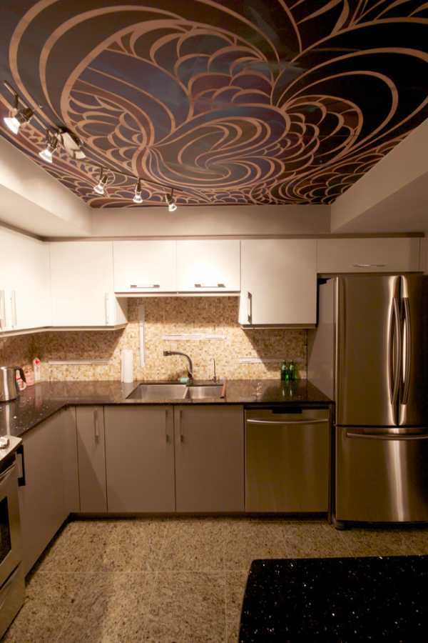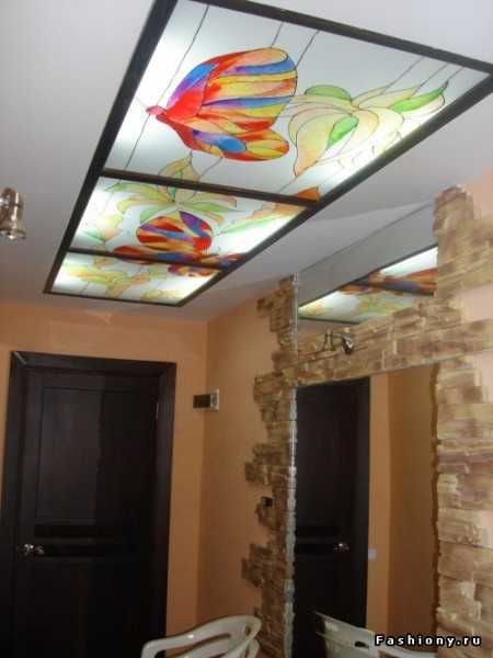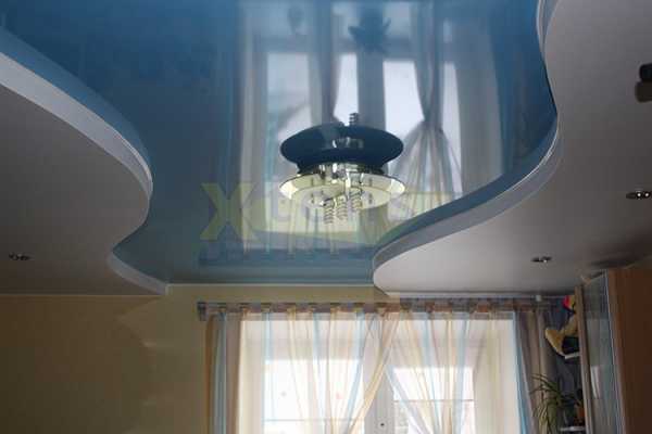 - Современный. Глянцевые потолки, окрашенные в различные цвета, а также с фотопринтами. Допустимы многоуровневые потолки.