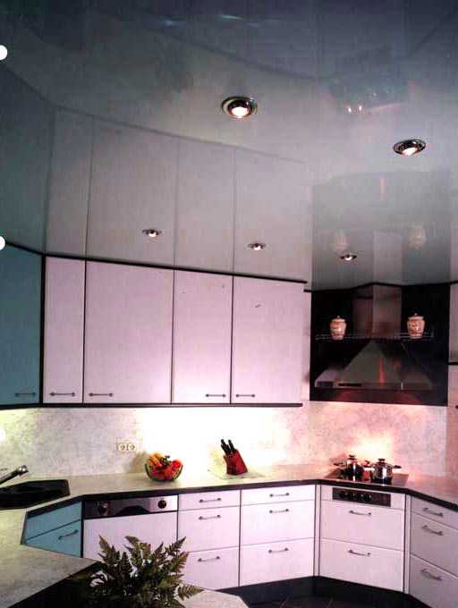 - Для кухни наиболее подходящим вариантом будет глянцевая поверхность. Дело в том, что такая пленка достаточно тонкая и быстро нагревается до температуры в помещении, поэтому на ее поверхности не будет образовываться конденсат. Кроме того пыль на таком гладком потолке скапливаться не будет.