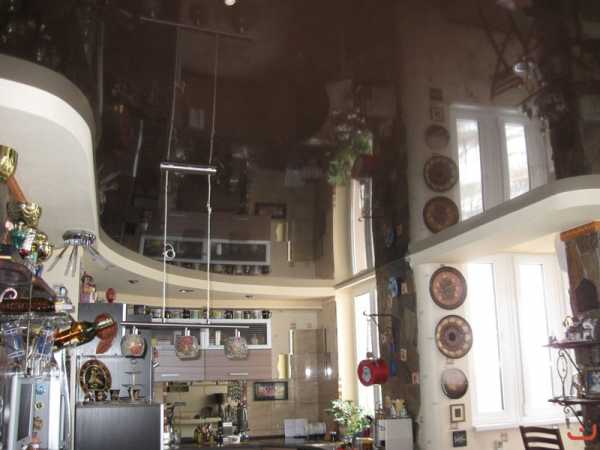 Материал натяжного потолкаДля маленькой кухни подойдет глянцевый материал. За счет отражающего свойства его поверхности пространство кажется больше и просторнее, чем на самом деле. Фото такого потолка представлено ниже.