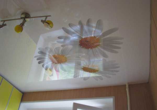 Объемные ромашкиНо стоит учитывать, что такой вариант визуально скрадывает полезное пространство. Потолок с нанесенным объемным фоторисунком органично смотрится в большой по площади кухне.