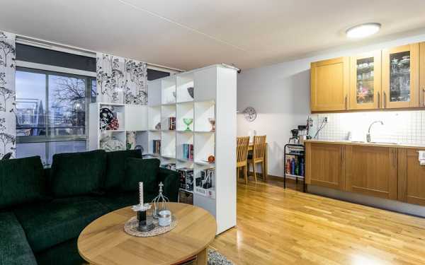 Двусторонний стеллаж. Доступ к нему есть и со стороны кухни, и из гостиной. Большой плюс — он пропускает свет. Такие «сквозные» стеллажи есть, например, у ИКЕА.
