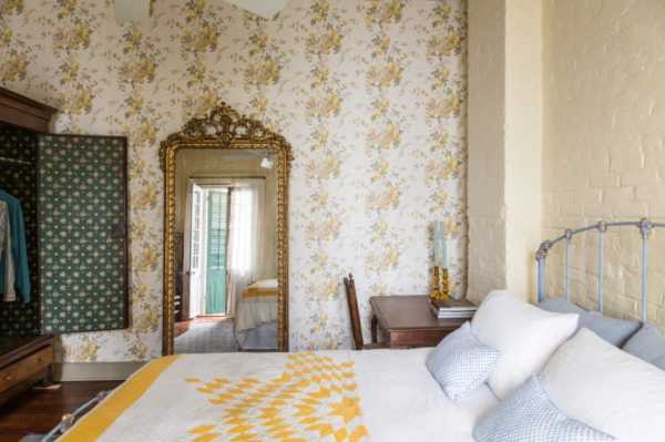 На фото спальня в стиле прованс и обои с цветами на стенах.