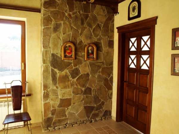 Выкладывая камень, обязательно проверяйте работу уровнем. Отделка прихожей имитацией камня на фото.