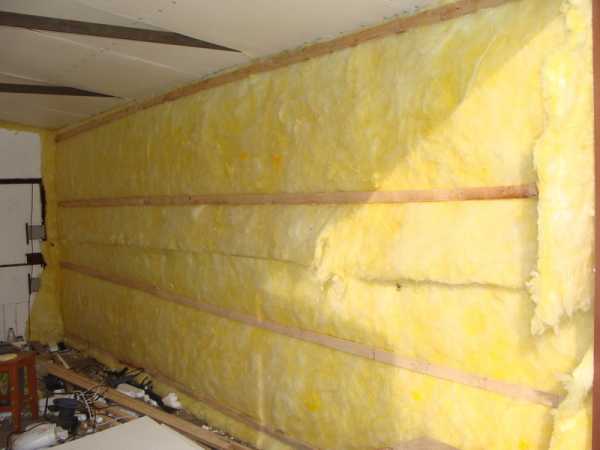 Так как между рейками обрешетки будет свободное пространство, его заполняют утеплителем. Это может быть минвата, ППУ, пеноплекс или пенопласт. При этом толщина рейки будет равна толщине утеплителя. Сверху все это покрывается пароизоляционной пленкой, а уже после происходит фиксация гипсокартона, вагонки или ОСБ.