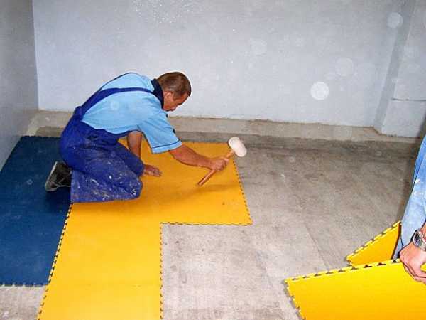 Монтаж модульных покрытий, как резиновых, так и ПВХ, осуществляется примерно одинаково. Для выполнения этой работы потребуется только деревянный или резиновый молоток. Если же модули будут монтироваться на клей, то нужно подготовить и зубчатый шпатель.
