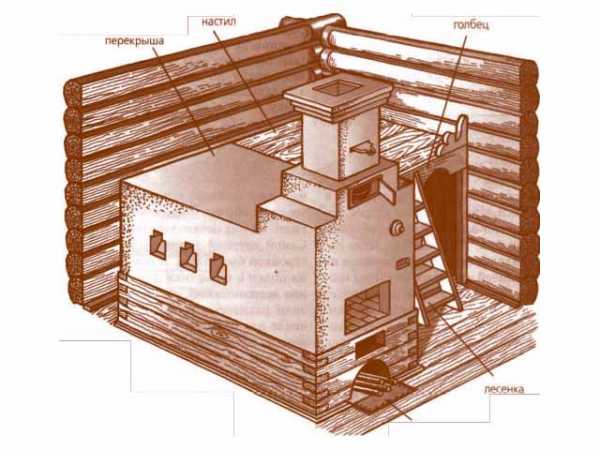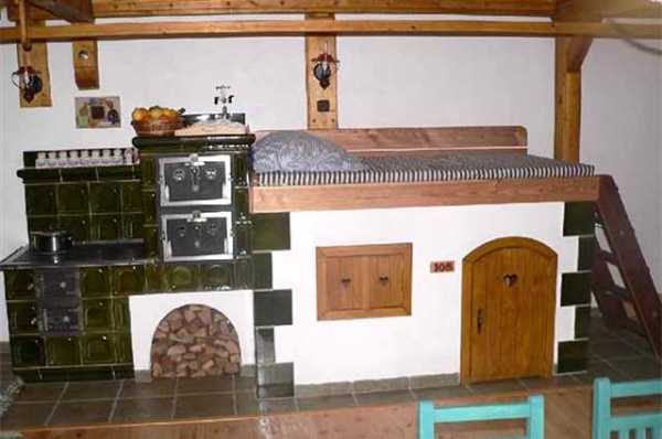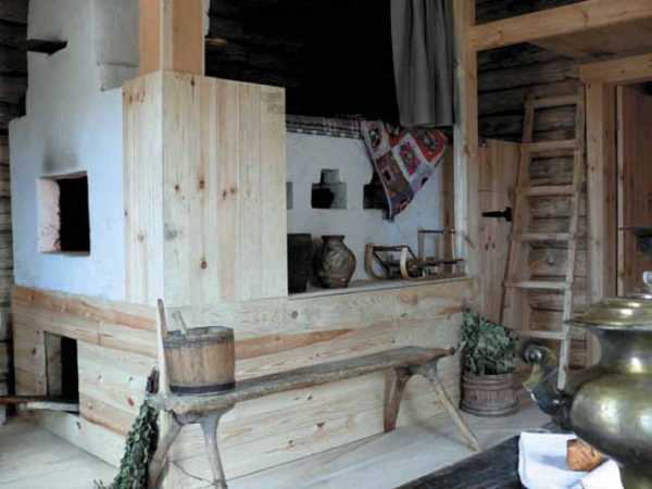 В печку входит не только сама кирпичная кладка, но и «печки-лавочки». Самой большой пристройкой был голбец, это был фактически шкаф со всевозможными полками. Поверхность перекрыши вместе с настилом голбеца образовывали просторную лежанку.
