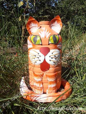 8. Кот — все детальки кота (уши, лапки, нос, язык, усики, вот эти белые штуки, на которых находятся усы, не помню, как они называются) — это вырезанные формочки из пластиковых бутылок. Туловище — это 5л баклажка из-под воды. Все покрашено краской соответствующих цветов. А хвостик — это завиток монтажной пены, вырезанный по нужной форме, стартовая шпаклевка, финишная шпаклевка для ровности, грунтовка и покраска. Хвостик ничем не крепила к коту, он — тяжелый и просто лежит вокруг кота. А в баклажку бросила около жменьки камешков щебня, чтобы туловище кота стало тяжелым и не летало во время ветра по саду!