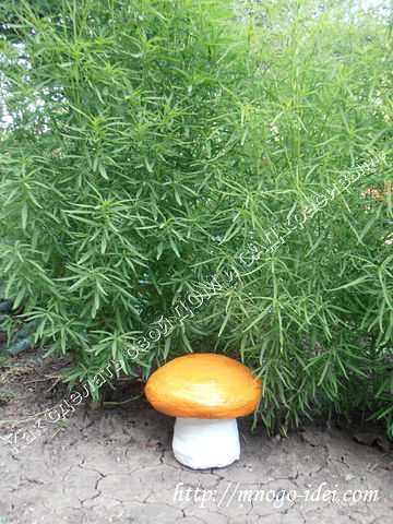 2. Гриб — Брала пустой баллончик от автомобильной краски для каркаса, потом обдувала его монтажной пеной по спирали (одного слоя хватает). Потом на обычный пакет надувала горку из пены (пакет нужен чтобы после высыхания легче отрывать). Пену на шляпку надувать в два-три этапа, так как если надуть горку сразу пена расползается и внутри не высыхает из за толстого слоя. Затем ножку и шляпку скрепляла между собой все той же пеной. дать хорошо высохнуть, чем больше тем лучше. Затем обычным ножом придаем форму. Затем стартовая шпаклевка, на шляпку еще можно тонкий слой финишной шпаклевки, так шляпка ровнее будет. Потом грунтовка но можно и без нее, но тогда придется красить в два слоя, так как шпаклевка является хорошо впитывающим материалом. Ну и покраска :).