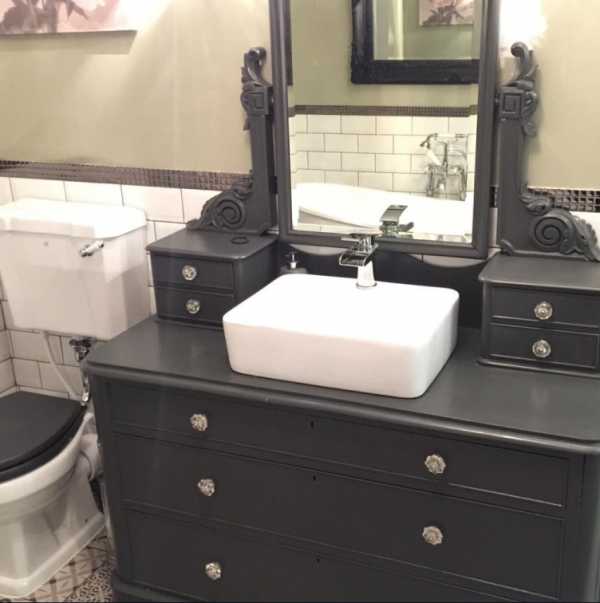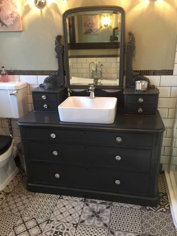 В окрашенной ванной комнате, если она просторная, замечательным решением станет использование мебели для хранения белья. Для ретро-дизайна может использоваться винтажный комод с многочисленными выдвижными ящиками, витиеватыми вставками, и местом для размещения дополнительных аксессуаров. Такой предмет мебели вполне способен стать хорошей альтернативой отдельному туалетному столику.