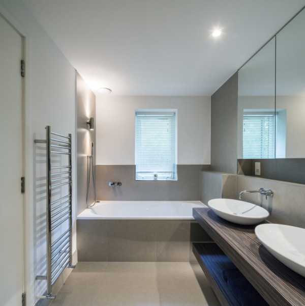 Для стен выбирают сочетание краски и плитки в ванной в монотонах. Это может быть серо-белая ванная комната, где серым окрашена верхняя часть стены, белой керамикой выложена панель около ванны, раковины, унитаза.