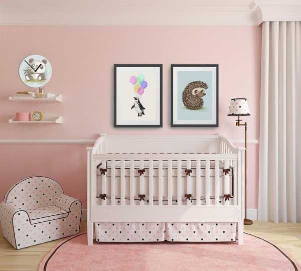 На фото детская для новорожденного и стены розового цвета с рисунками.