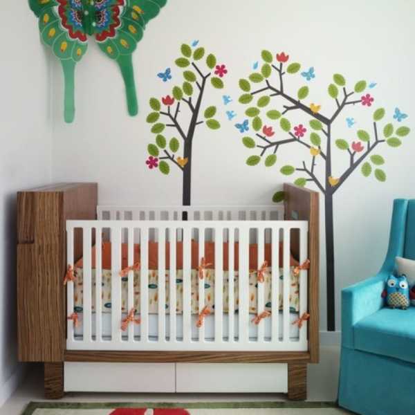 На фото наклейка в виде дерева на стене в детской комнате для новорожденного.