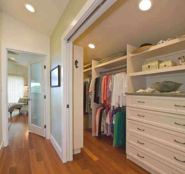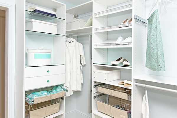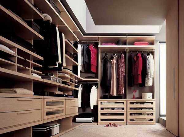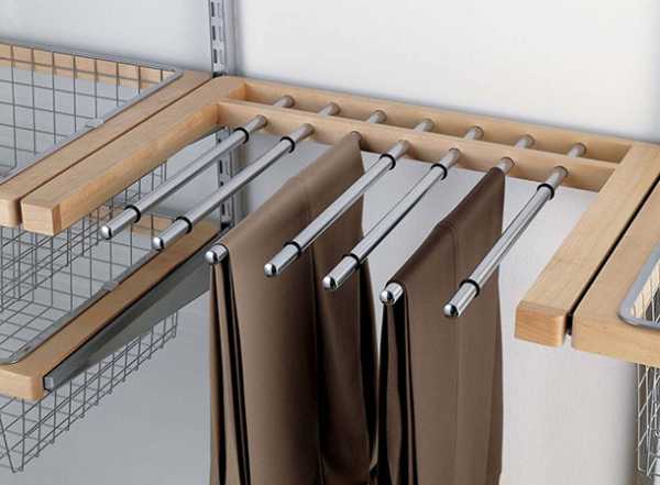Специалисты советуют применить модульные конструкции: открытые полки, выдвижные ящички, металлические штанги для размещения одежды на плечиках.