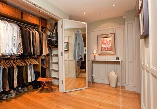 В случае, когда прихожая имеет большие габариты, в закрытой гардеробной можно устроить свой небольшой будуар. Можно расположить зеркало или даже установить трюмо. Но, такой вариант должен быть хорошо продуман заранее, правильно распределено пространство и обустроены функциональные зоны.