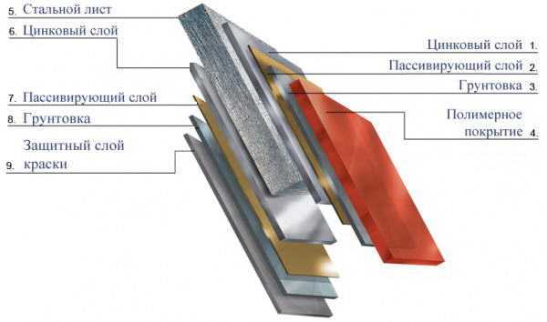На лист следует нанести специальное покрытие с антикоррозийными свойствами. После этого наносится слой хроматный для обеспечения адгезии. Затем на листы наносится грунтовка, а потом покрытие из полимеров. Оттенки можно выбрать на собственное усмотрение.