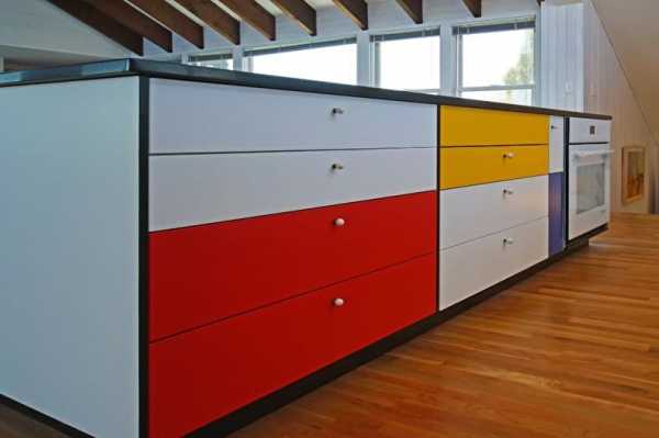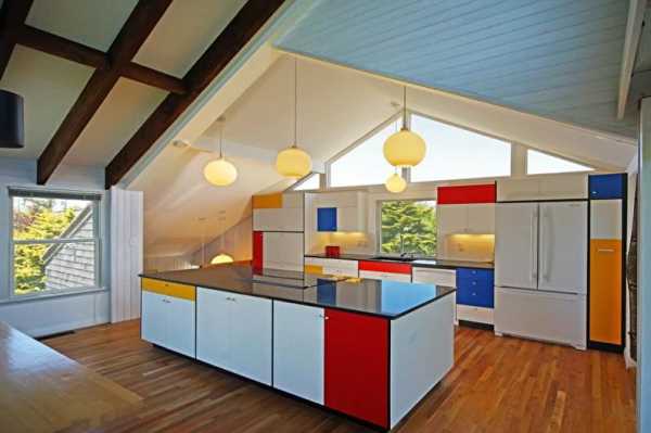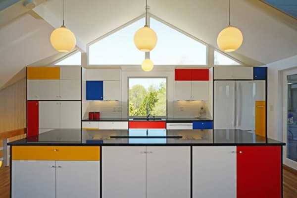 Эта кухня находится в пляжном доме на острове в штате Массачусетс, площадь помещения равна 17 кв.м. Дизайнер Кэрол Хантер разрабатывала проект, ориентируясь на увлечение заказчицы современным искусством, в частности, творчеством Мондриана.