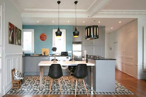 Добавив в цветовую палитру насыщенный синий, дизайнеры смогли наполнить кухню светом. Этот прием выделяет лепнину и рамы, изысканные карнизы и молдинги. Для разделения кухонной и обеденной зоны от гостиной пол выполнен плиткой на цементной основе с изысканным узором в стиле ретро. С помощью данного решения удалось отказаться от установки перегородочных конструкций. Монохромная плитка с графичным орнаментом замечательно смотрится на фоне ярких стен в синем цвете и нейтральных серых предметов мебели.