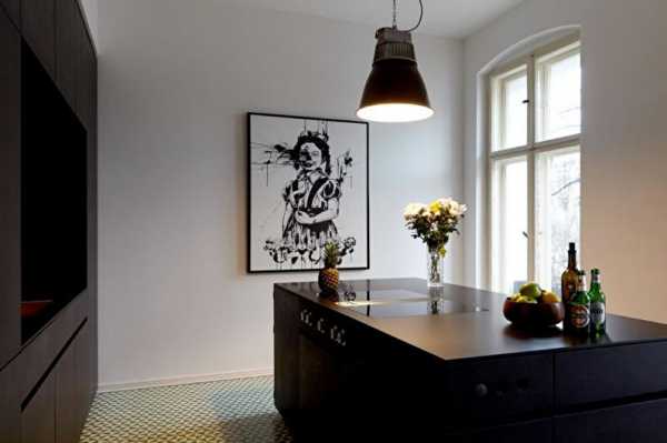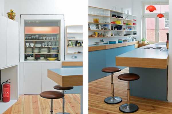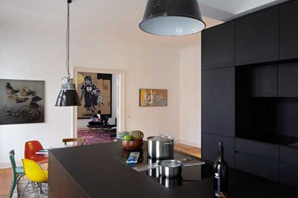 Берлинские дизайнеры Бернард Курц и Йоханнес Кроне перепланировали помещение и снесли стену, разделяющую столовую и кухню. После этого кухонная зона была поставлена на цоколь, высота которого достигает 10 см. В нем скрыты отопительные коммуникации для пола и другие инженерные конструкции.