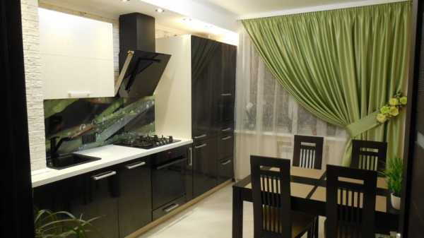 На фоне светлых стен в просторной кухне очень интересно будут смотреться контрастные шторы из мягкой ниспадающей складками ткани, красиво драпированные и перевязанные широкими атласными лентами.