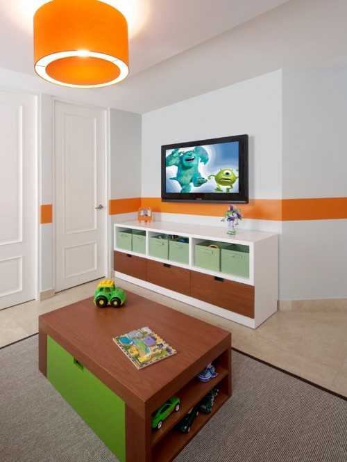 Если вашему малышу всего 2-3 года, то такая комната должна быть максимум просторной, иметь обязательно мягкий пол и все то, что потребуется для развития ребенка – большой мяч, бумагу с карандашами, много игрушек.