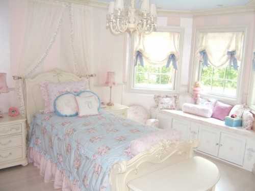Комнату девочки можно оформить в виде будуара сказочной принцессы. Тут найдётся место и для кукольного домика Барби, и небольшого туалетного столика за которым маленькая красавица будет приводить себя в порядок, укладывая косички. Кровать предлагаем сделать с балдахином из лёгкой струящейся ткани.
