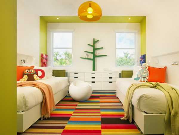В комнате сестёр, как и в комнате двух мальчиков редко будет идеальная чистота. Разумно оставить основную часть пола открытой и застелить её крепким линолеумом или тёплым ламинатом. Но для активных игр необходимо более комфортное пространство. Великолепным решением станет небольшой цветной коврик, который можно легко поместить в стиральную машинку. Помимо основной функции (игровой), он сыграет на пользу маленькой комнаты – визуально увеличив пространство.