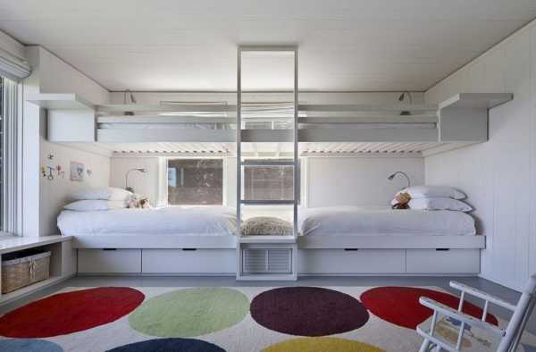- Если ваши дети предпочитают подвижный образ жизни, то оставьте много свободного пространства. Установите кровати плотнее к стенам, а ещё лучше, обзаведитесь выдвижными или раскладными кроватями.