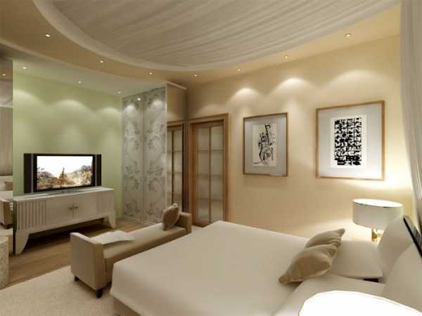 Пример визуального расширения пространства за счет светлых цветов и натяжного потолка — ремонт спальни в хрущевке на фото
