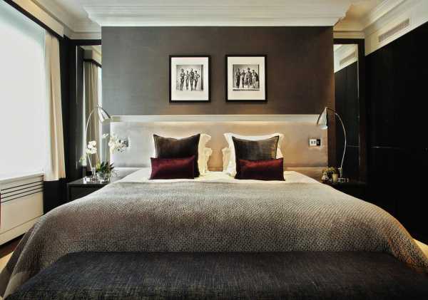 Наверняка, вы много раз слышали, что для отделки маленького помещения используются светлые тона. Однако не стоит недооценивать темные цвета. Это весьма эффективный приём. В тёмном помещении углы скрадываются, и границы комнаты словно стираются. При этом создаётся удивительно уютная и камерная атмосфера. А что ещё нужно в спальной? Для этой задумки подойдёт тёмно-серая, насыщенная синяя и коричневая гамма.