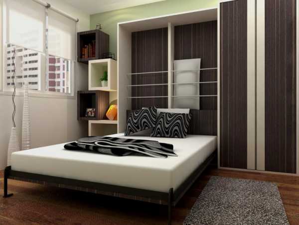 Большое спальное ложе занимает все свободное пространство. Поэтому в маленькую спальню целесообразно установить французскую подвесную кровать, убирающуюся под потолок или в шкаф.