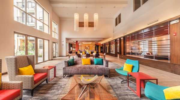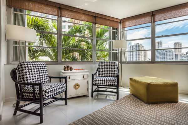 Большое зеркало с богатым обрамлением делает интерьер гораздо больше и ярче. Бирюзовая обивка на стульях приносит Miami цвет в номер.
