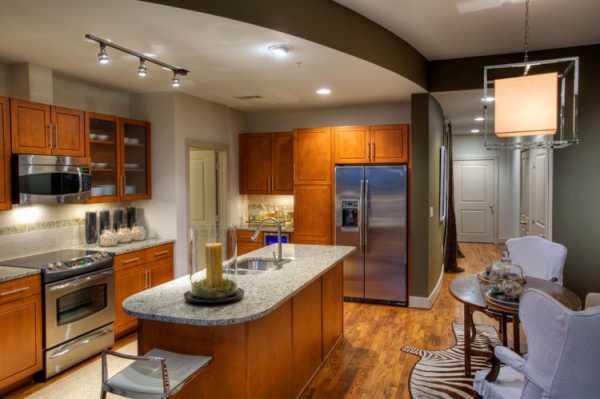 Дизайнер включил глянцевые поверхности, с которыми смело констатирует глубокий оттенок дерева ореха. Помещение оборудовано всем необходимым для создания изумительных кулинарных блюд.